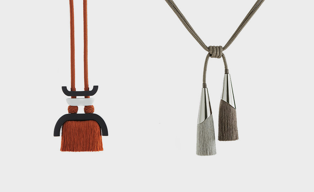 將蠟繩原料制作出仿皮效果后,交織成一根肌理清晰的粗繩,配上亞光的金屬接頭,呈現出硬朗與簡約。